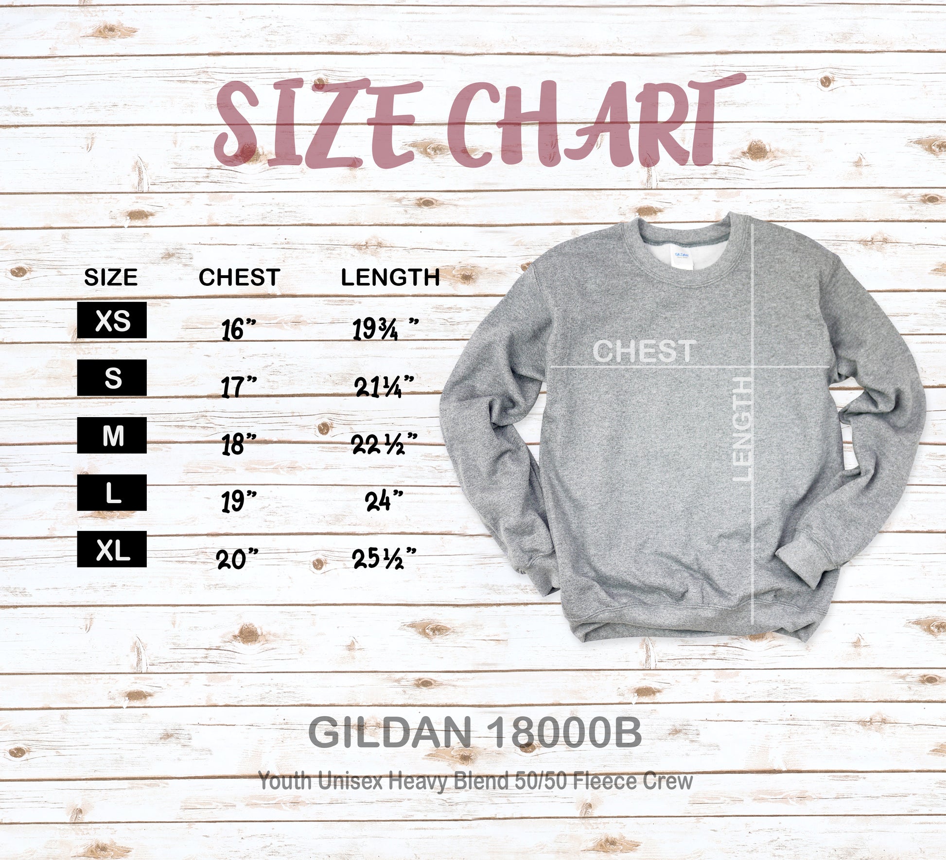 - Gildan Crewneck Sweatshirt Color: Dark Heather Youth Sizes & Adult Sizes
